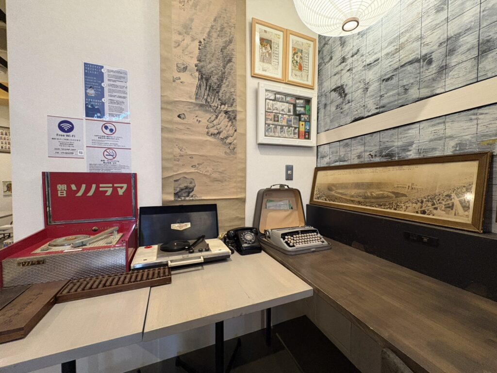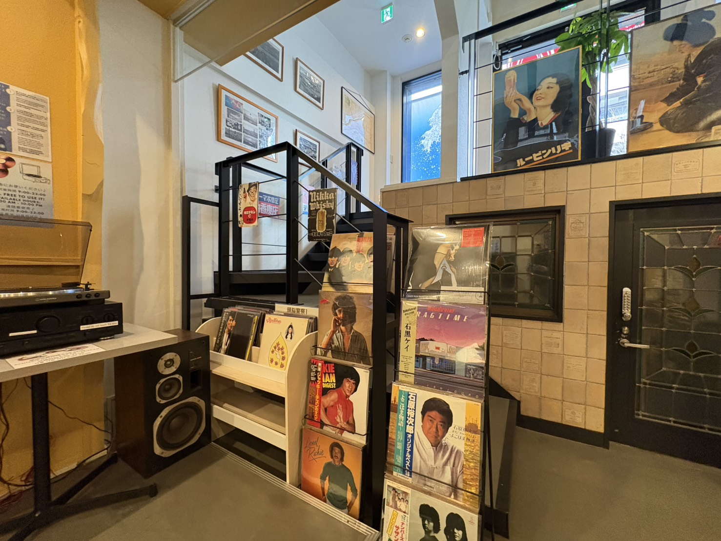 船底である地下1階はスーツケースのお預かりスペース、旅の疲れを癒しながら他の旅行者様と談笑できるようなサロンスペースをご用意しております。こちらでも横浜を訪れるお客様に、日本や横浜の過去の魅力を存分に感じてもらえるスペース作りをしております。過去の歴史ある作品をそのまま展示しております、レコード等は横浜の魅力、古き昭和の記憶、そして港町横浜が海外から受けてきた文化を受け入れてきた世界感を意識した選曲をしておりますので自由にお楽しみください、時代ものの貴重なレコードもあるため、展示品と同様に大切に扱ってください。